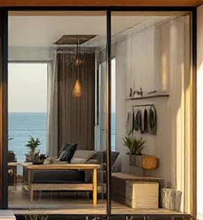 Bước qua cánh cửa gỗ ấm màu nắng, bên trong mở ra một không gian thoáng đãng với tông sáng chủ đạo. Nội thất tối giản, nhưng từng chi tiết đều được chăm chút để tôn lên sự hài hòa: ghế sofa trung tính, bàn gỗ mộc mạc, vài mảng xanh điểm xuyết, tất cả kết nối liền mạch cùng cảnh biển ngoài khung kính.