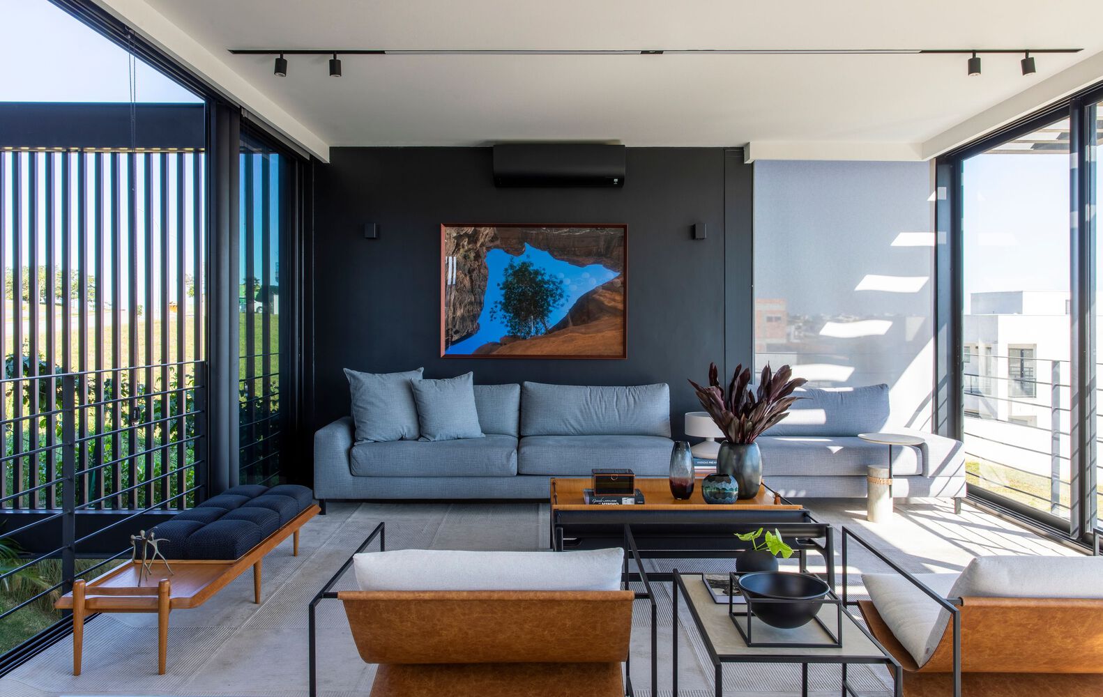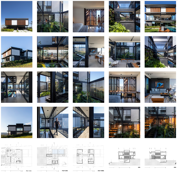 Vị trí khu đất trên sườn dốc, nằm ở điểm cao của khu vực, cho phép ngôi nhà tận dụng tối đa tầm nhìn hướng về dãy núi Serra da Mantiqueira. Phòng khách và bếp được bố trí chiến lược nhằm khai thác triệt để cảnh quan này. Đồng thời, các khoảng rỗng bên trong công trình được tính toán cẩn trọng để tạo nên sự kết nối thị giác xuyên suốt giữa các không gian, tận dụng hiệu ứng trong – ngoài và chiều sâu không gian. Khu sân trong được chia thành hai mảnh vườn nhỏ, vừa đóng vai trò cải thiện vi khí hậu, vừa tạo nên những khung cảnh sinh động từ nhiều góc nhìn.