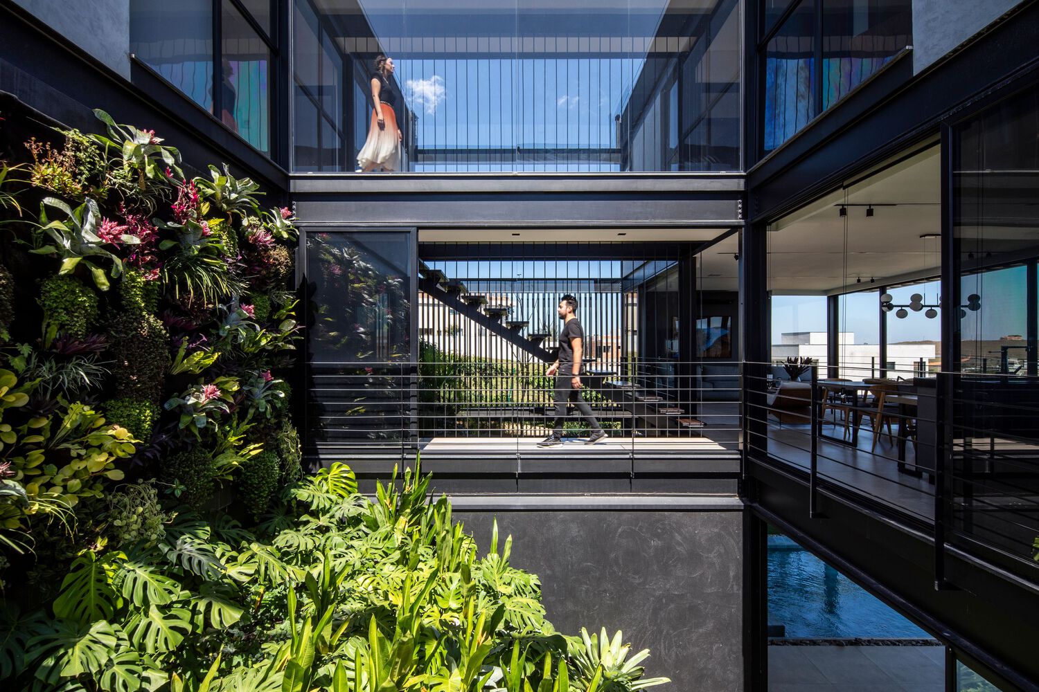 Về mặt kết cấu, công trình sử dụng hệ khung thép kết hợp sàn deck – một giải pháp thi công hiện đại giúp giảm thiểu lượng rác thải xây dựng, loại bỏ nhu cầu dùng ván khuôn gỗ như trong kết cấu bê tông truyền thống. Ngôi nhà còn được trang bị hệ thống tái sử dụng nước mưa cho tưới tiêu cảnh quan và hệ thống pin năng lượng mặt trời để sản xuất điện sạch phục vụ nhu cầu sinh hoạt của gia đình.