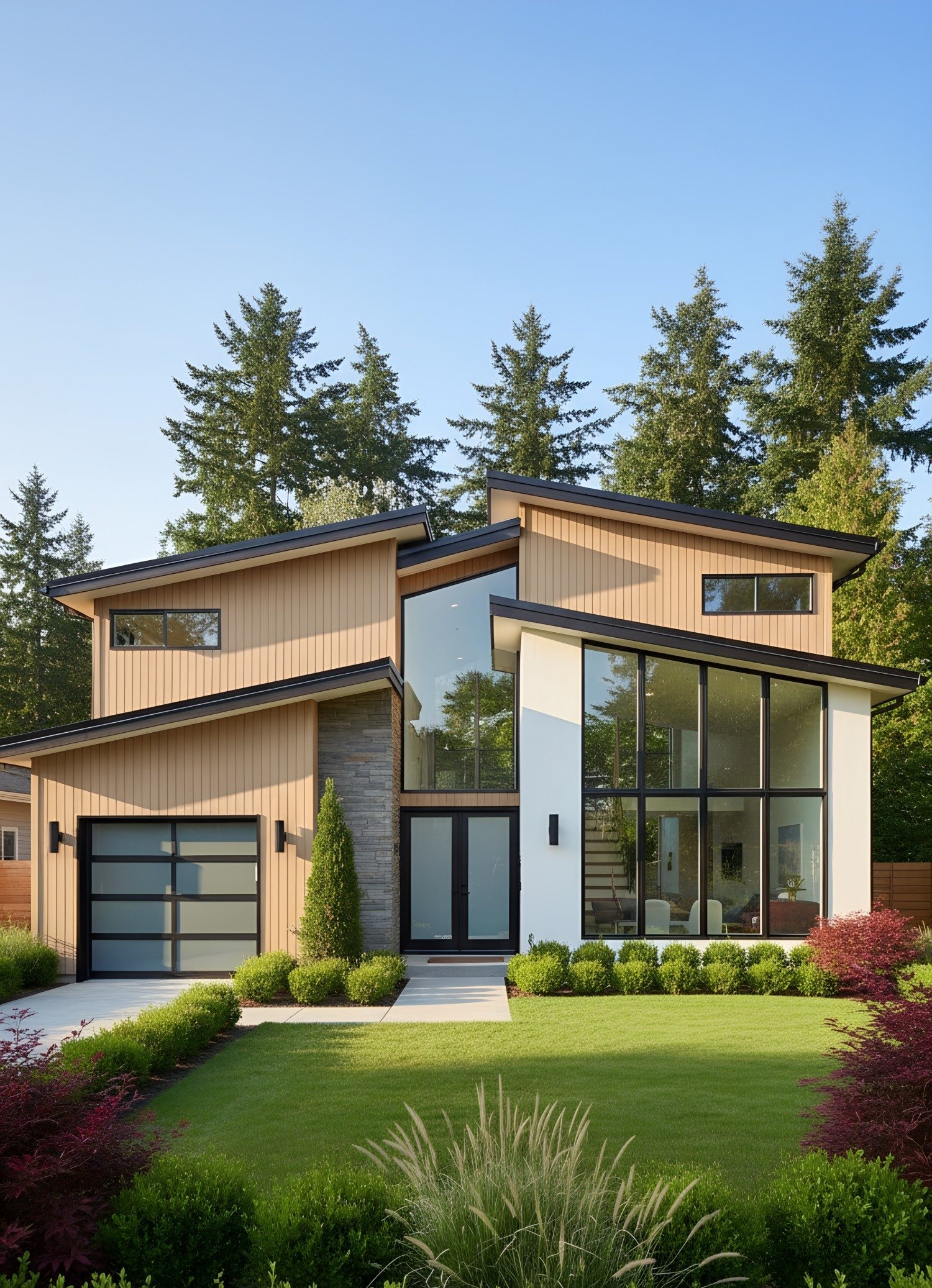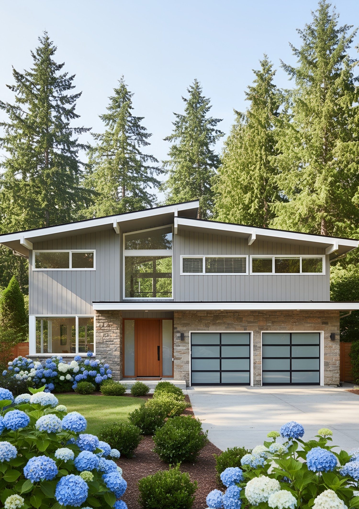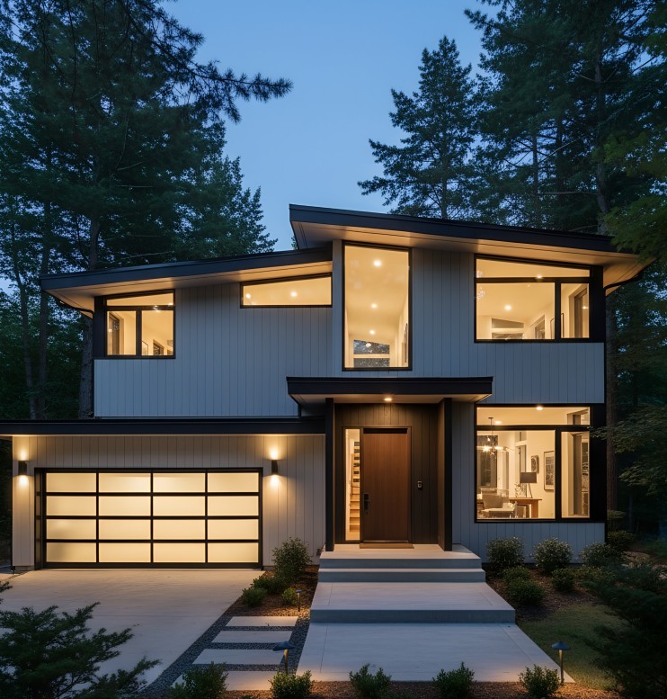 Ngôi nhà hai tầng phong cách mid-century modern gây ấn tượng mạnh với đường mái góc cạnh và hệ cửa kính khổ lớn, mở ra tầm nhìn tối đa. Giữa khung cảnh rừng cây cao vút, mặt đứng phối hợp gỗ và đá tự nhiên tạo cảm giác vững chãi nhưng vẫn gần gũi.