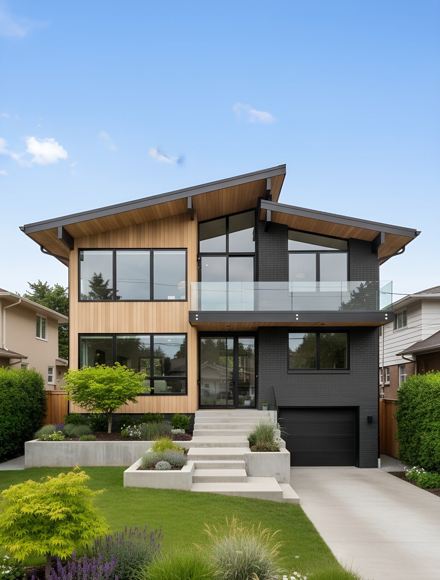 Hãy chiêm ngưỡng một ngôi nhà hai tầng thanh lịch, kết hợp hài hòa giữa gỗ và gạch. Những ô cửa kính lớn không chỉ mở ra tầm nhìn thoáng đạt mà còn tạo nên nhịp điệu ánh sáng tinh tế trong không gian sống.