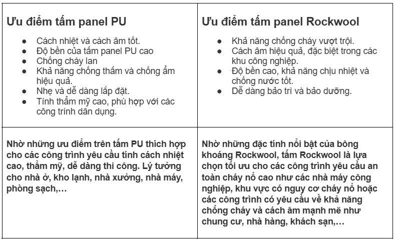 Cả tấm panel PU và tấm panel Rockwool đều có độ bền ấn tượng trong các môi trường và ứng dụng khác nhau. Tuy nhiên, lựa chọn giữa hai loại tấm này sẽ phụ thuộc vào yêu cầu đặc thù của công trình: